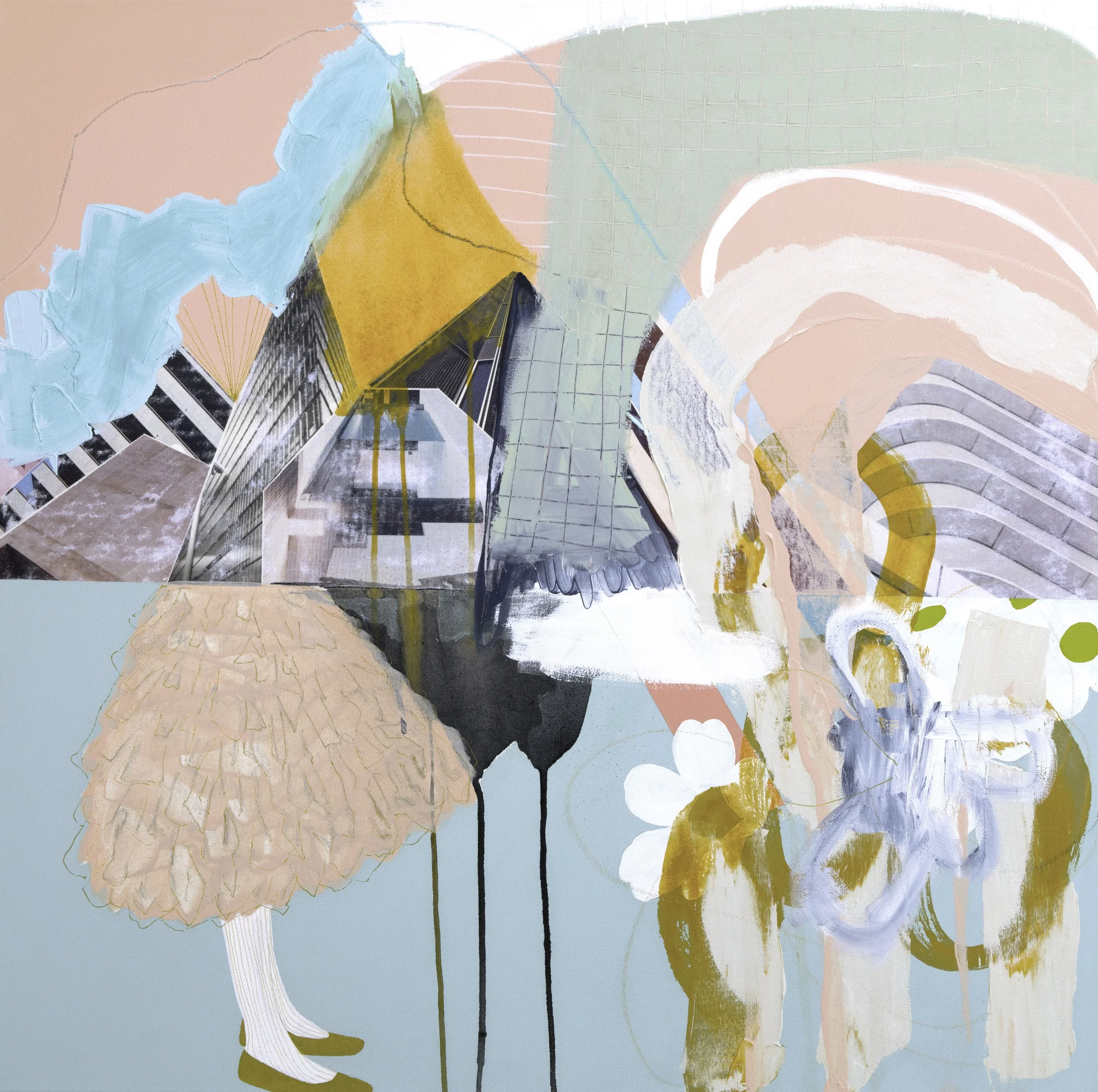 Levon’s art is a conversation between layers, structured grids, playful marks, soft blushes of pink weaving through every piece, and colours that carry memories and feelings.